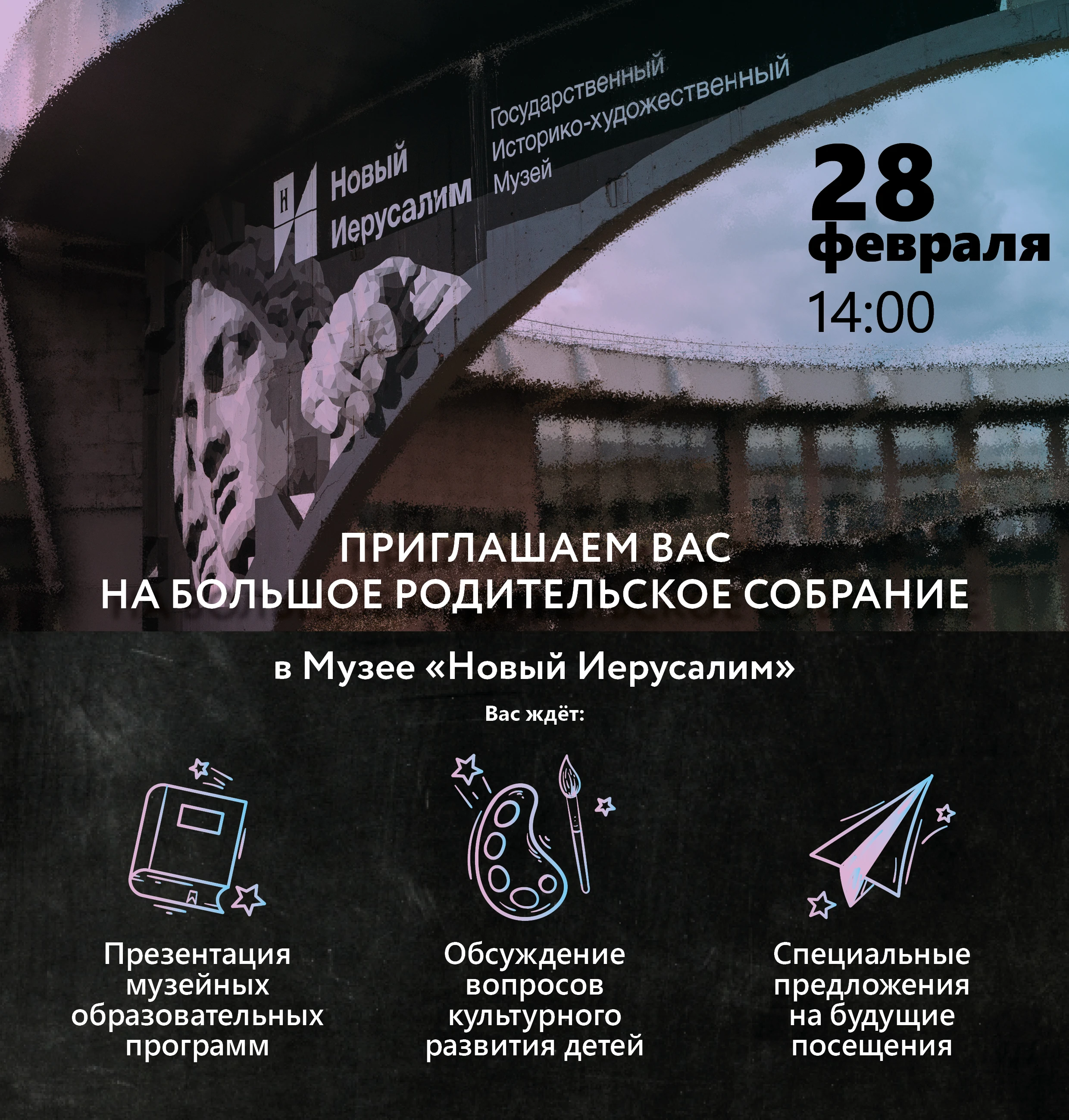 28 февраля в 14:00 в музее пройдет Большое родительское собрание для неравнодушных родителей, активистов родительских комитетов, педагогов и представителей образовательных учреждений на встречу-знакомство. На собрании у вас будет замечательная возможность снова почувствовать себя ребёнком и самим принять участие в музейных программах для подрастающего поколения.