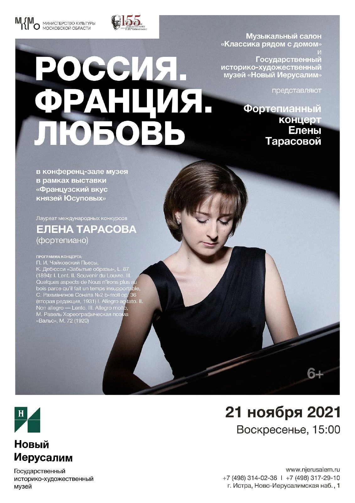 Музыкальный салон «Классика рядом с домом» и Государственный историко-художественный музей «Новый Иерусалим» 21 ноября в 15.00 представили вниманию фортепианный концерт Елены Тарасовой «Россия. Франция. Диалоги» в Конференц-зале музея в рамках выставки «Французский вкус князей Юсуповых».