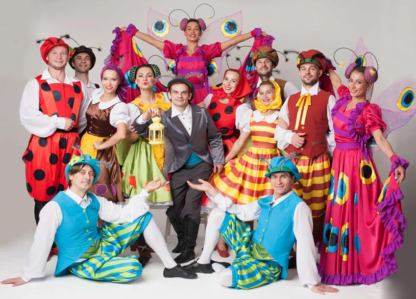 Только представьте, в гости на именины к Мухе пришли целый оркестр её друзей во главе с Кузнечиком-дирижером и танцевальный ансамбль Бабочек и Букашек. На сцену вышли 35 артистов!