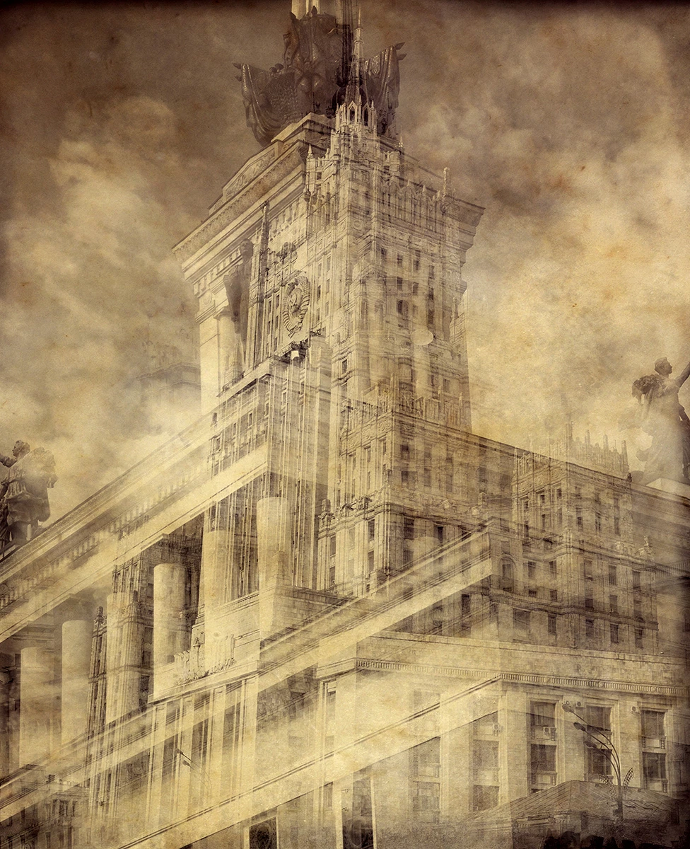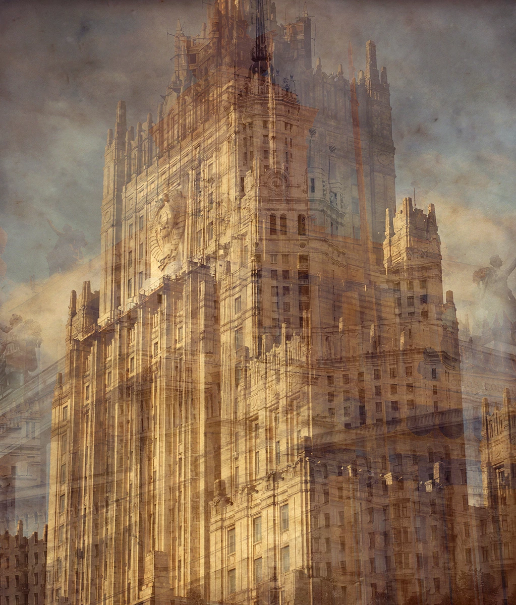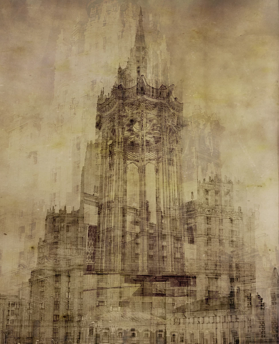 Первый зал показывает красоту человеческого деяния — архитектуру. На двухметровых деревянных панелях и холстах представлены коллажные изображения монументальных высоток советского периода, во многом определявших историческое лицо Москвы начала пятидесятых годов. В фокусе работ, представленных автором в этом зале, — привычная архитектура высоток в технике коллажа, распространенная в 20–30-х годах XX века и связанная с именами Александра Родченко, Эль Лисицкого и других. У Владимира Клавихо-Телепнева коллажи становятся портретами-воспоминаниями Москвы, которая еще сохраняется, но в то же время оказывается уже оставшейся в прошлом.