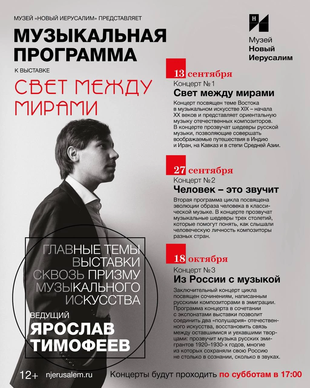 Ведущий программы — музыковед, лектор, музыкальный критик и композитор Ярослав Тимофеев, уже хорошо знакомый гостям музея по фестивалю «Лето. Музыка. Музей» и циклу концертов «Музыка с Ярославом Тимофеевым».