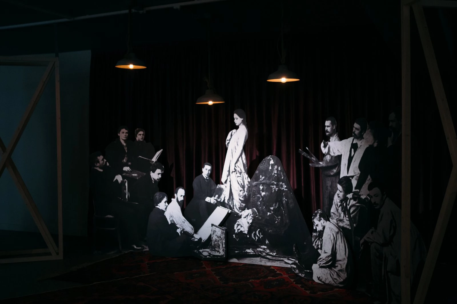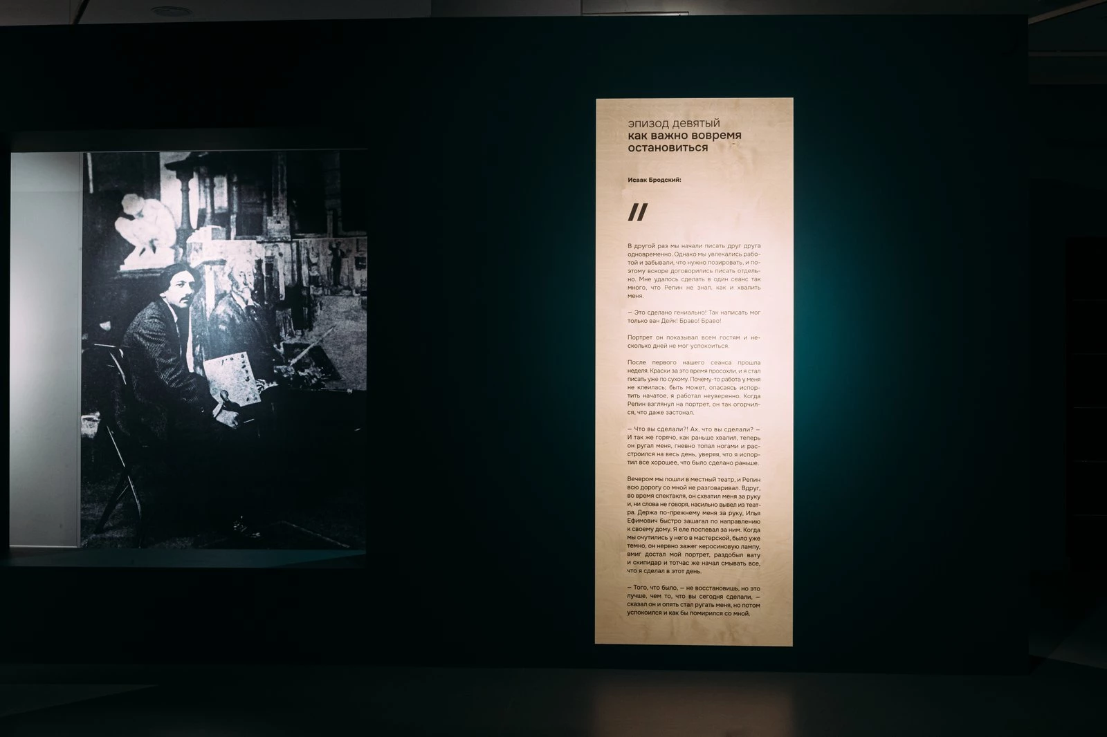 Параллельную историю рассказывают «Эпизоды» — сцены из жизни Мастера и мастерской, составленные из фрагментов воспоминаний учеников Репина. Вместе с архивными фотографиями и сценографическими решениями «Эпизоды» превращают выставку живописи в атмосферную и многоликую историю творческого поиска и взросления.